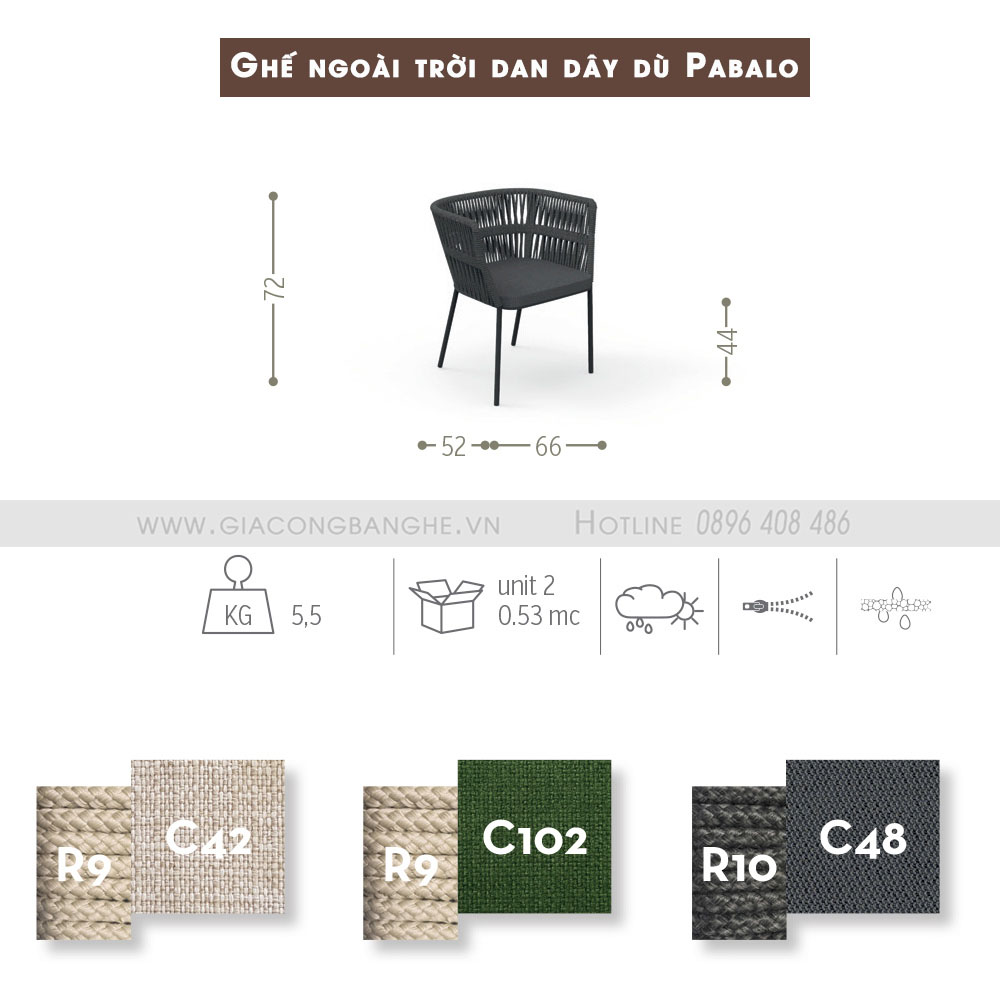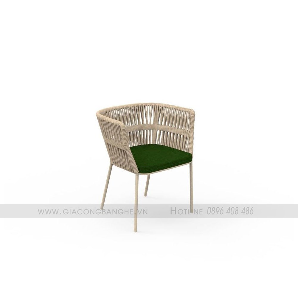 Ghế ăn ngoài trời cao cấp SKLC031 được đặc trưng bởi một cấu trúc làm bằng dây tổng hợp và ghế đan bằng vải dù có thể tháo rờ. Dây tổng hợp gồm một dây bện đôi lõi polyester và vỏ bọc propylene nhiều dây dù. Sợi bên ngoài mà nó được làm là không thấm nước và chống tia cực tím.