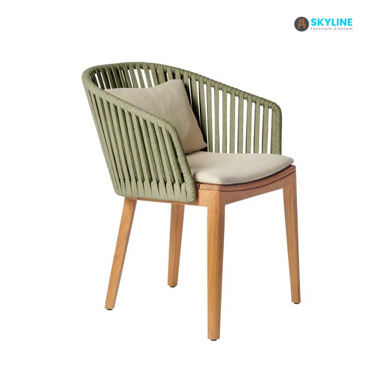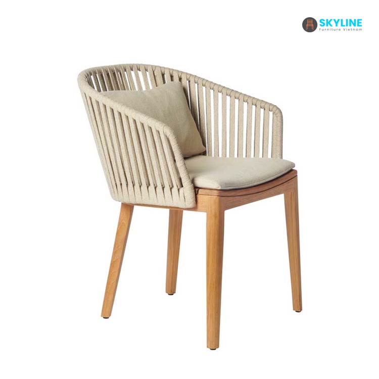 Ghế ăn nhà hàng SKLC084 có chân gỗ được bo tròn và được phủ lớp sơn màu gỗ tự nhiên tạo nên vẻ đẹp sang trọng của ghế này. Ghế sử dụng sợi dây đan mềm mại dây đan mềm mại, chống chịu được thời tiết tốt, và đặc biệt có độ đàn hồi cao. Đệm ghế và gối tựa lưng mang lại cảm giác mềm mại và êm ái giúp bạn có những giây phút thư giãn, dễ chịu.