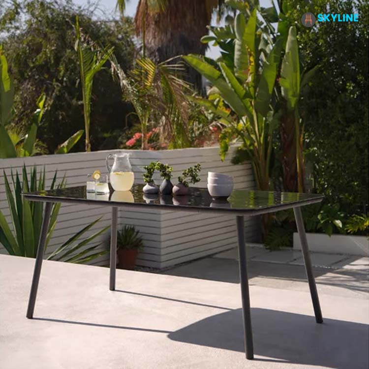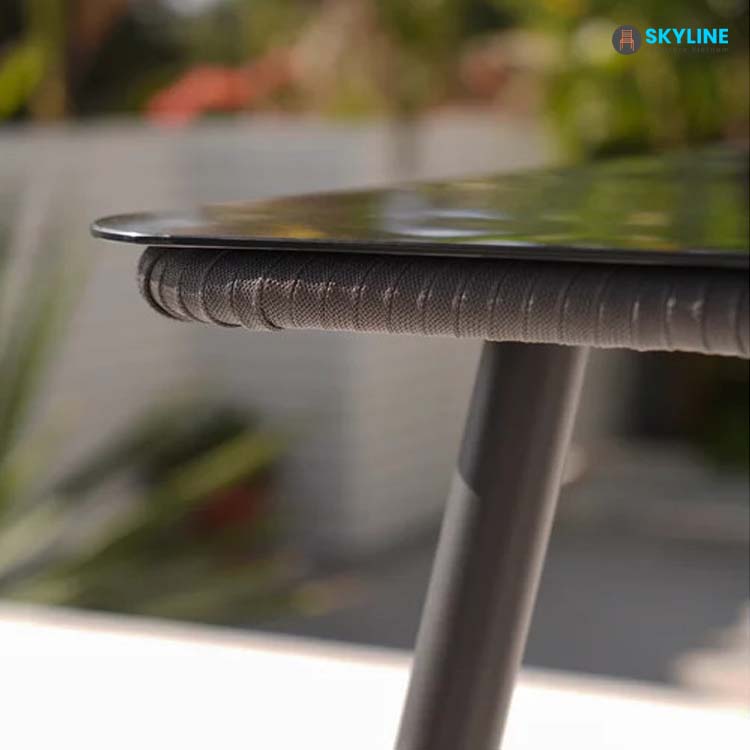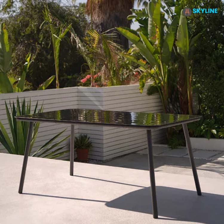 Bàn ăn ngoài trời SKLT024 mang nét hiện đại và sang trọng, có thiết kế gọn gàng thanh mảnh mang lại vẻ đẹp độc đáo cho sản phẩm này. Bàn ăn này là sự kết hợp hoàn hảo giữa chất liệu nhôm cao cấp và kính cường lực.