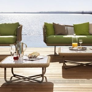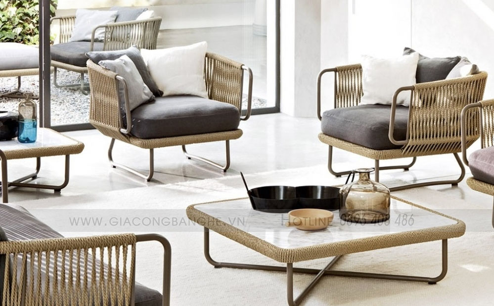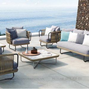- Chất liệu: Sắt/ nhôm/ inox sơn tĩnh điện, vải ngoài trời, mousse D20/D30/D40, mây nhân tạo, dây dù,…