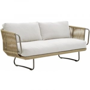 Khung được làm bằng nhôm sơn tĩnh điện, được trang trí đan dây thủ công tinh tế. Nệm sử dụng ngoài trời chống thời tiết tốt bổ sung độ êm ái và thoải mái hơn khi sử dụng thời gian dài. Bàn trà được dùng mặt đá tự nhiên và đan dây xung quanh viền.