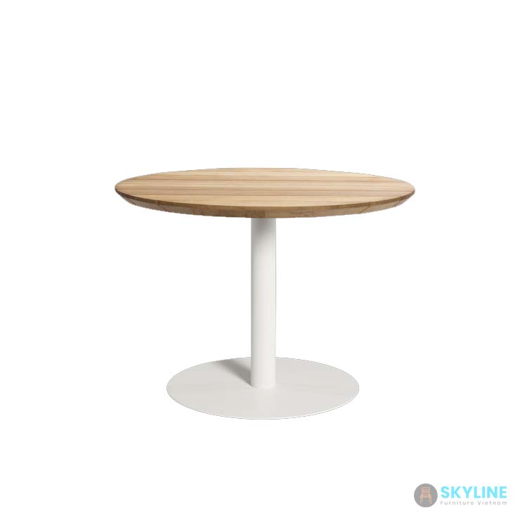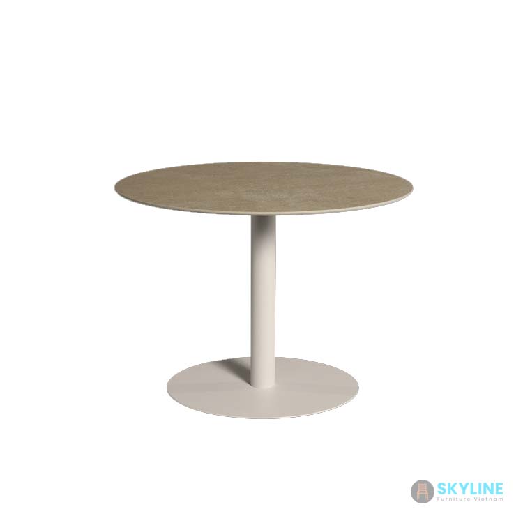 Bàn tròn cafe SKLT020 có hình chữ T, một trục ống kim loại sơn tĩnh điện chắc chắn làm trụ, đế làm từ kim loại nguyên khối cứng cáp. Mặt bàn có gồm nhiều chất liệu tùy thuộc vào yêu cầu: đá Marble tự nhiên, đá Granit tự nhiên phủ một lớp chống thấm, bề mặt bóng có thể nhìn thấy bầu trời và gợi nhớ như mặt nước, mặt gỗ teak cứng và chắc chắn, mặt bê tông siêu nhẹ.
