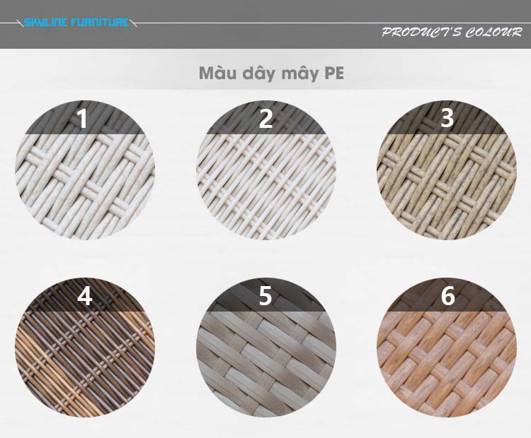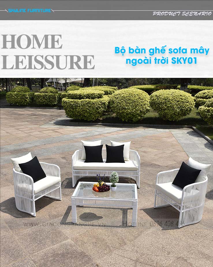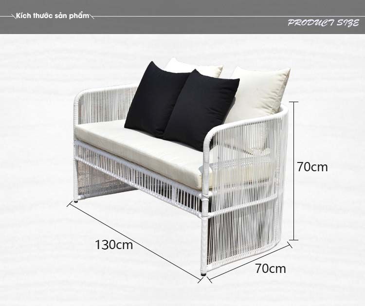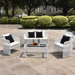 - Chất liệu: Sắt/ nhôm/ inox sơn tĩnh điện, vải ngoài trời, mousse D20/D30/D40/DWF, mây nhân tạo, dây dù,…