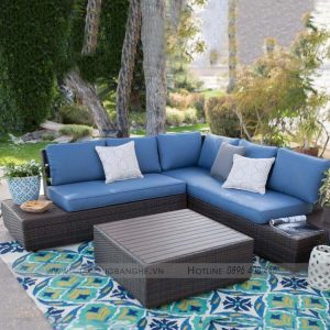 - Chất liệu: Sắt/ nhôm/ inox sơn tĩnh điện, vải ngoài trời, mousse D20/D30/D40/DWF, mây nhân tạo, dây dù,…