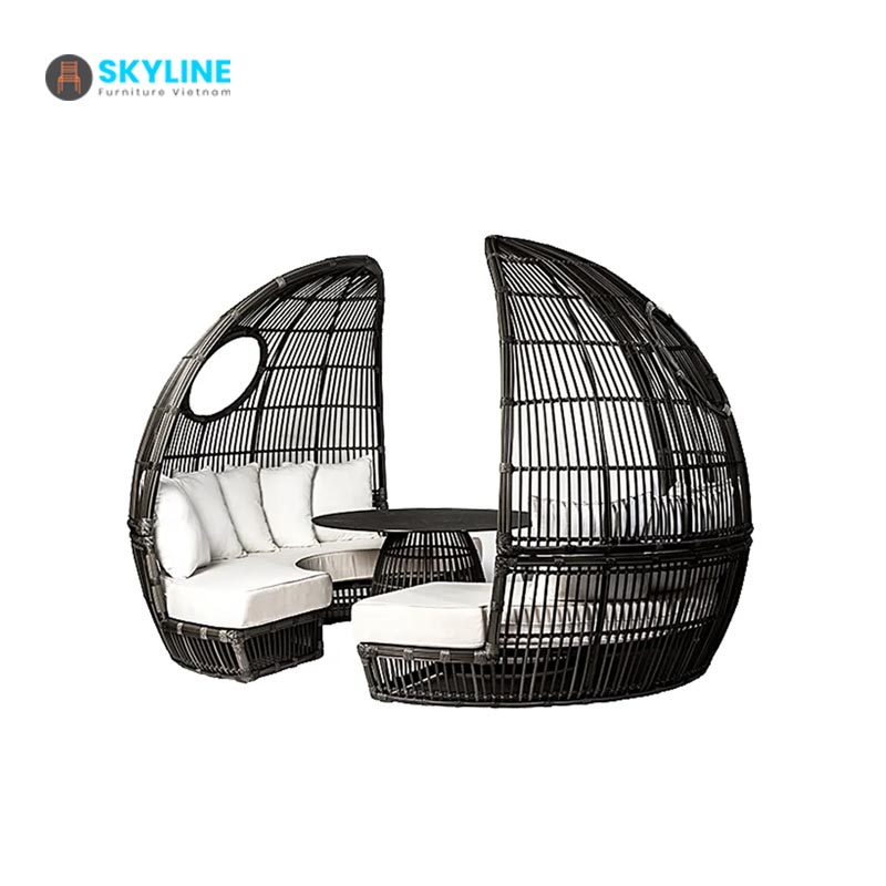 Ưu điểm mẫu bàn ghế này màu sắc tự nhiên, gần gũi với không gian thiên nhiên ở sân vườn, sản phẩm được sản xuất công tỉ mỉ từ khâu chọn vật liệu, đan dây và chọn nệm… vì thế sản phẩm luôn đạt được chất lượng cao. Luôn được ưa chuộng bởi những người trung niên mang tính sang trọng và hiện đại. Chỗ ngồi rộng và hình tròn khiến nó trở nên hoàn hảo cho những giây phút thư giãn trong vườn hoặc bên hồ bơi kết hợp bàn trà hình tròn mềm mại, trong khi phần trên của ghế mang lại bóng râm tinh tế khỏi những tia nắng gay gắt nhất.