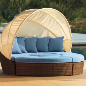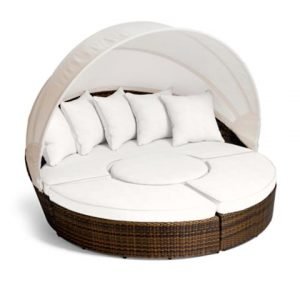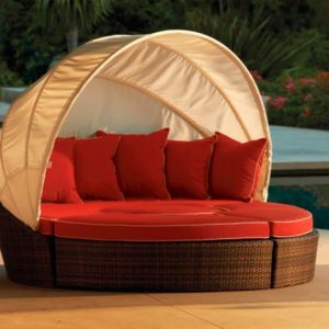 - Bộ 5 món bao gồm: ghế dài đôi, ghế đôn tròn, hai ghế dài cong, một mái che râm mát tự nhiên, cùng với đệm ngồi và gối tựa