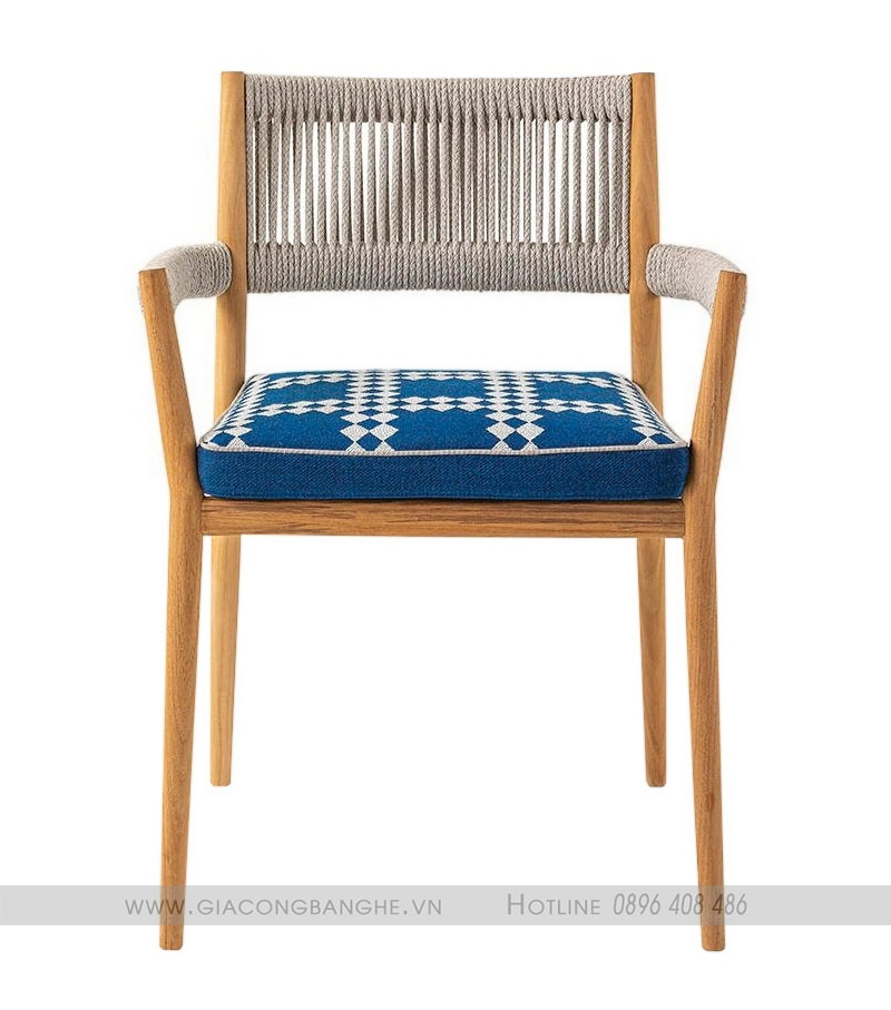 Ghế ăn nhà hàng SKLC054 có khung bằng gỗ teak chắc chắn được trang trí bằng một sợi dây polypropylene màu xám dệt tay thủ công xung quanh tay vịn và phần trên phần tựa lưng. Đệm ngồi sử dụng lót bằng vải chống thấm, và sử dụng cao su có độ dàn hồi cao.