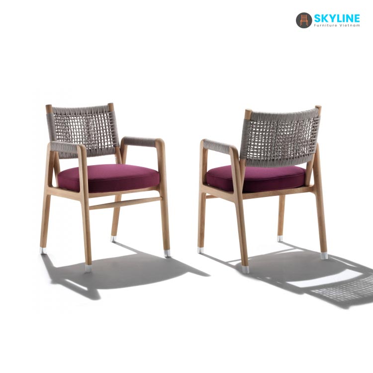 Được thiết kế phong cách hiện đại tinh tế cho khu vực ăn uống ngoài trời, tối đa hóa không gian, đem lại cảm giác thoải mái dễ chịu. Ghế có thể xếp chồng lên nhau dễ dàng ghép nối với bàn ăn, có khung bằng gỗ tếch chắc chắn được trang trí bằng dây đan polypropylene (hay còn gọi là dây dù) màu xám dệt tay thủ công xung quanh tay vịn và phần trên phần tựa lưng. Sự thoải mái của chỗ ngồi được đảm bảo bởi đệm lót bằng vải chống thấm và bọt polyurethane gắn qua hai dây đai vào các thanh gỗ tếch rắn để lại khung gỗ trong tầm nhìn và được tô điểm bằng đường viền bằng hạt gros màu xám ở mép trên.