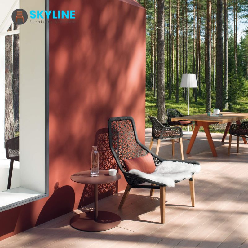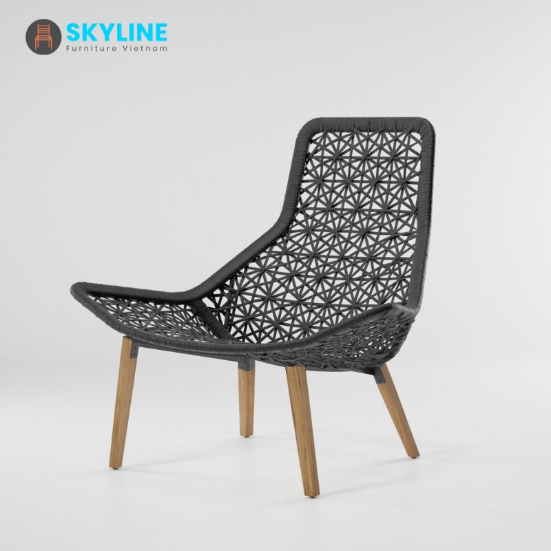 Ghế bành thư giãn ngoài trời SKLC048 của Skyline các yếu tố chỗ ngồi mang nét quyến rũ truyền thống cổ điển được diễn giải lại với một sự rung cảm đương đại. Cấu trúc của ghế bành cao cấp, chân ghế được làm hoàn toàn bằng gỗ Teak chắc chắn, được chế tác thủ công với các kỹ thuật gợi nhớ đến truyền thống chế tạo đủ tốt, sơn PU tự nhiên ngoài trời hoặc lau dầu ngoài trời. Lưng tựa và mê ngồi được làm từ kim loại sơn tĩnh điện hoàn thiện dây đan, chân đế nhựa chống trầy xước sàn.