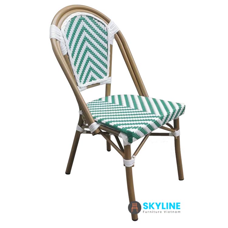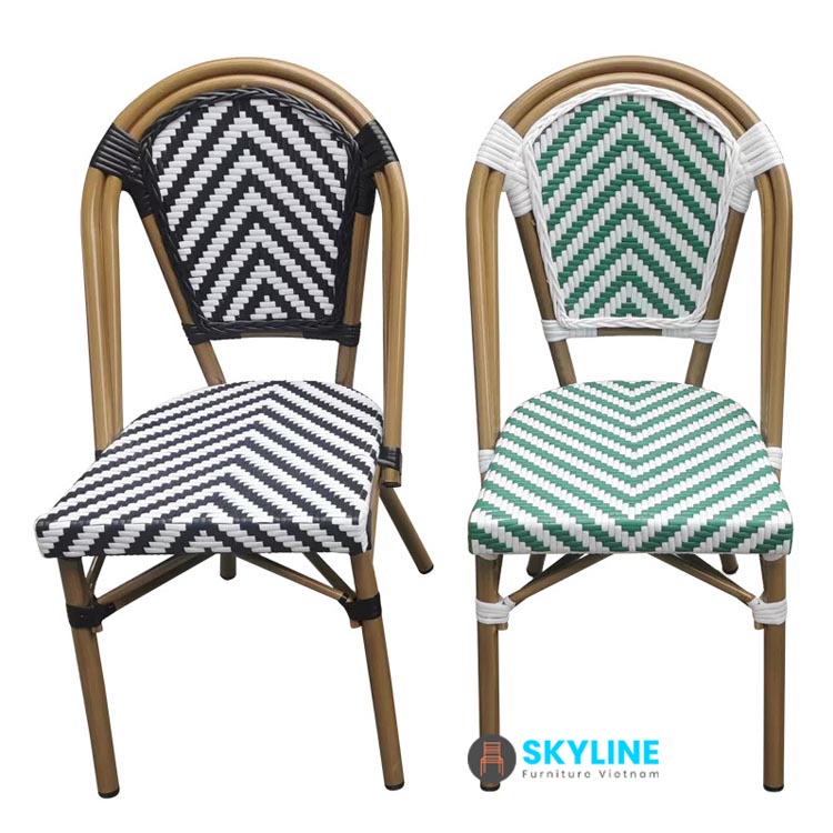 Ghế cafe đan mây nhựa SKLC107 được thiết kế đơn giản với phần khung nhôm được sơn giả cổ mang lại kiểu dáng đẹp và chắc chắn. và sử dụng dây mây nhựa có độ bền cao thời gian.