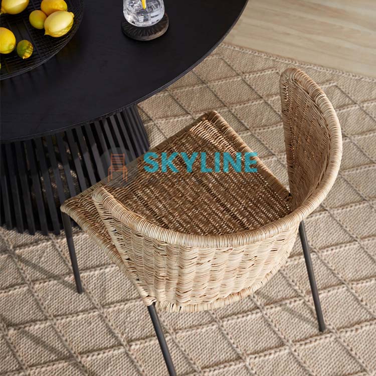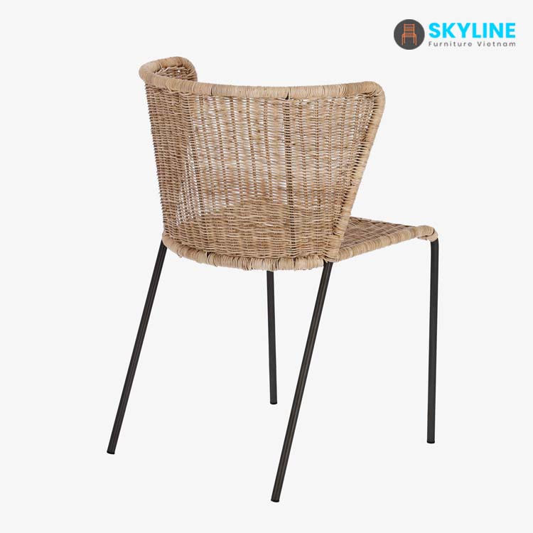 Mặt ngồi và lưng của ghế mây nhựa SKLC099 được đan bằng mây nhựa, được đan lát bằng tay có độ thẩm mỹ cao và chắc chắn. Khung kết cấu được làm bằng thép sơn tĩnh điện đen chống gỉ sét và tạo màu sắc của sản phẩm.