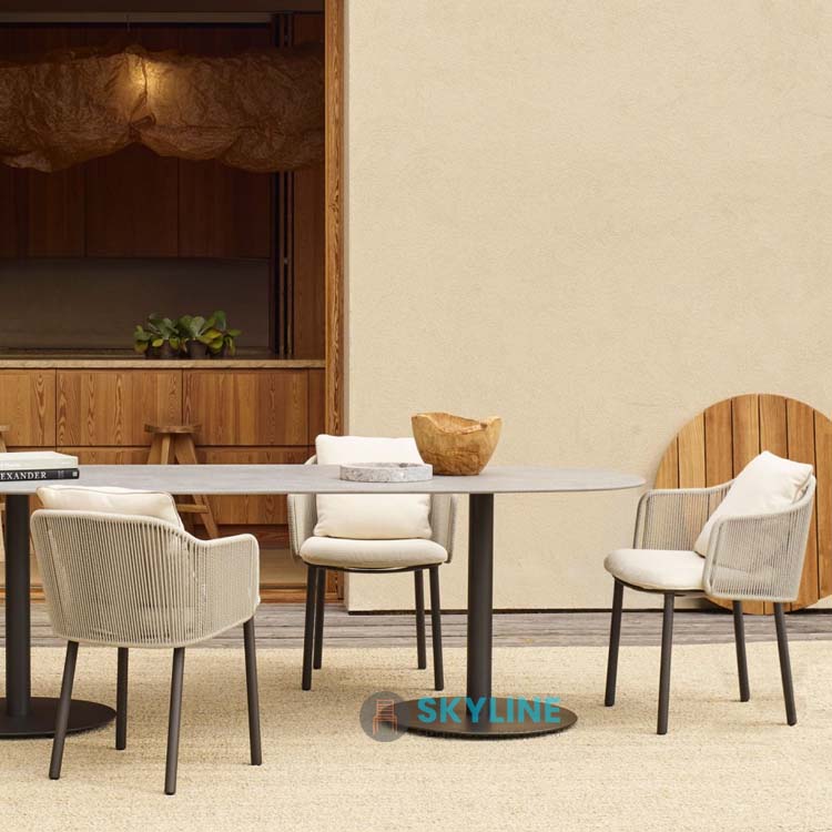 • Chất liệu: Sắt/ nhôm/ inox sơn tĩnh điện, vải ngoài trời, mousse D20/D30/D40/DWF, mây nhân tạo, dây dù,…