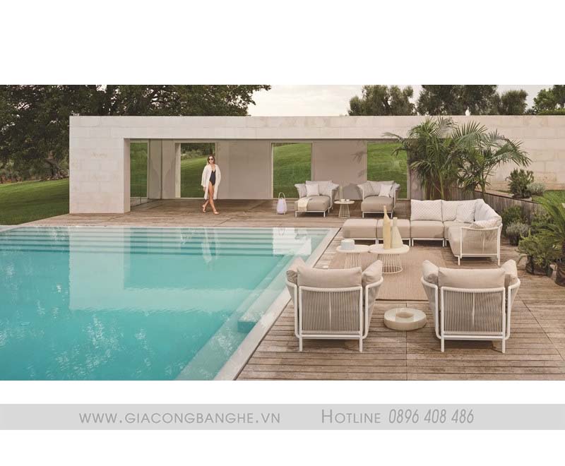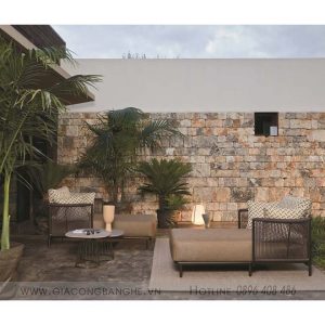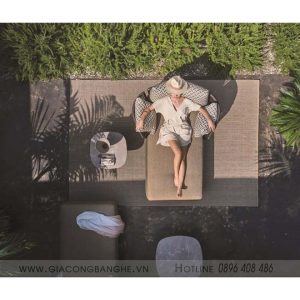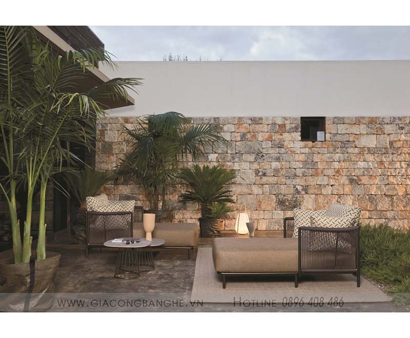 - Chất liệu: Sắt/ nhôm/ inox sơn tĩnh điện, vải ngoài trời, mousse D20/D30/D40/DWF, mây nhân tạo, dây dù,…