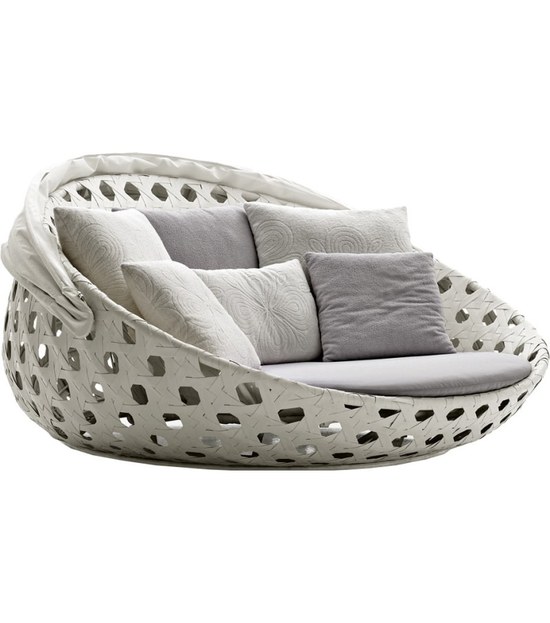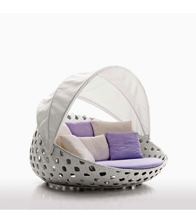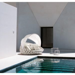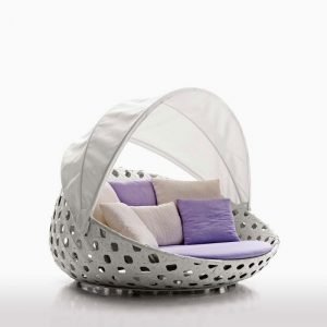 Ghế tắm nắng có mái che SKTN028 là dòng ghế có đặc điểm là đan xen bởi sợi dây mây nhân tạo dẹp, tạo hình thủ công điêu luyện theo hình dạng mắt cáo.
