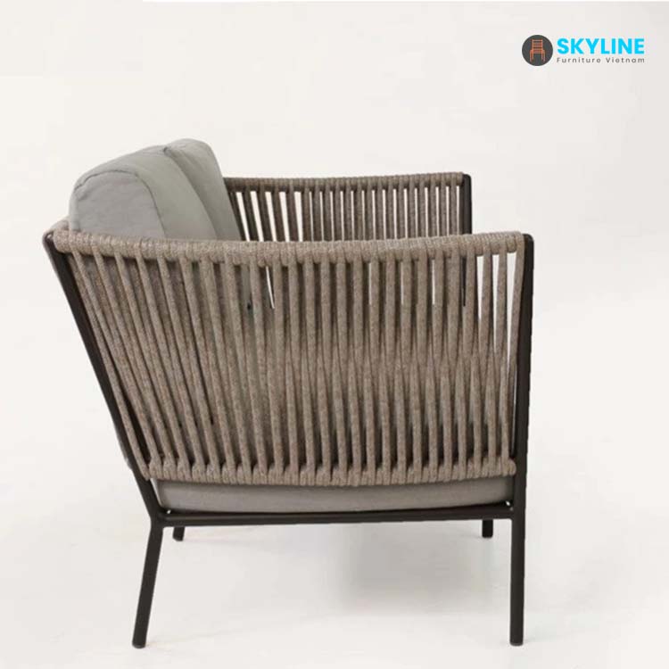 - Chất liệu: Sắt sơn tĩnh điện, vải ngoài trời, mousse D40, mây nhân tạo.