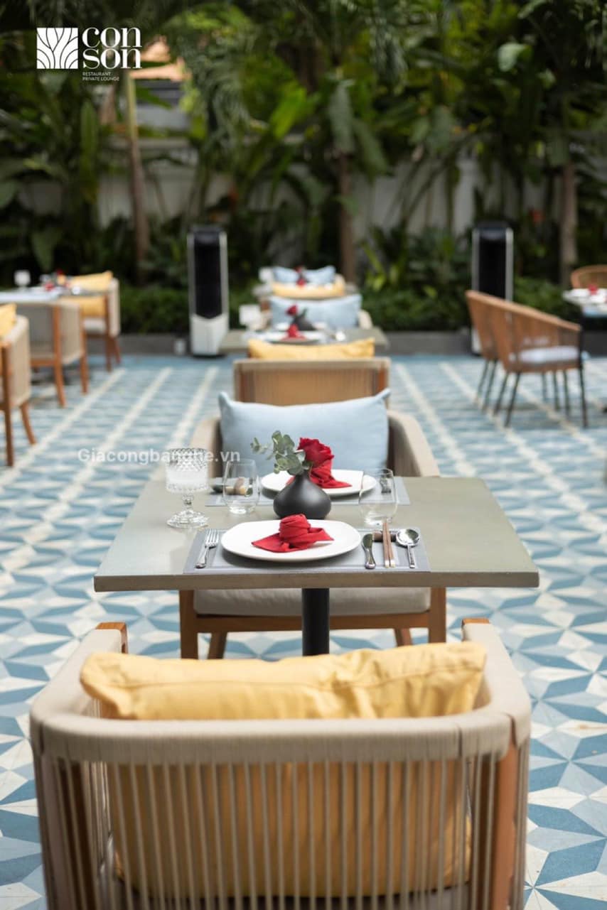 Gia công bàn ghế Côn Sơn Restaurant & Lounge một dự án thiết kế cao cấp, sang trọng và gia công theo yeu cầu phù hợp với không gian quán, Đặc biệt không gian sân vườn ngoài trời, hòa quyện cùng thiên nhiên xanh mát, Vì vậy những thiết kế và thi công rất tỉ mỉ và khắc khe về chất lượng.