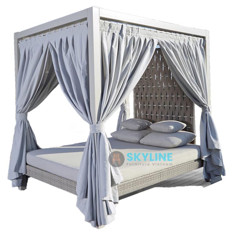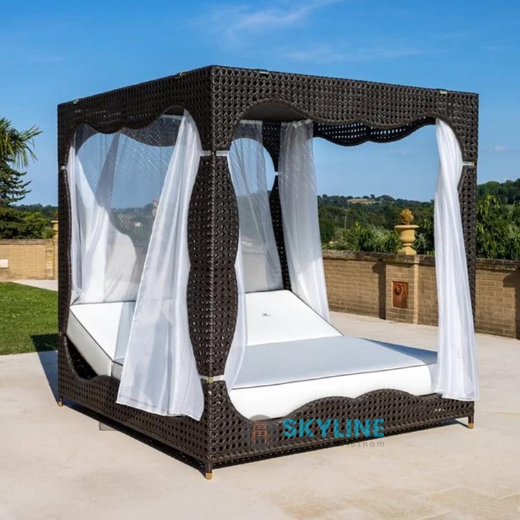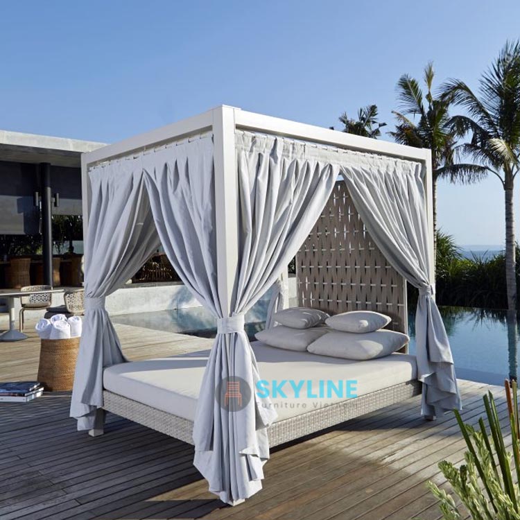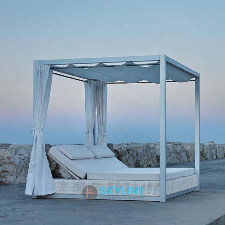 Xưởng gia công giường tắm nắng có mái che SKTN016 ở TPHCM và Bình Dương, ngoài ra chúng tôi còn gia công bàn ghế sắt, nhôm, gang, gỗ, inox,… . Xưởng gia công bàn ghế đan dây nhựa giả mây, dây dù ở TPHCM, Bình Dương, giá cả hợp lý với doanh nghiệp của bạn.