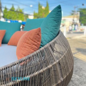 - Chất liệu: Đan dây nhựa giả mây, nệm bọc mousse d40 bọc vải cỏ may