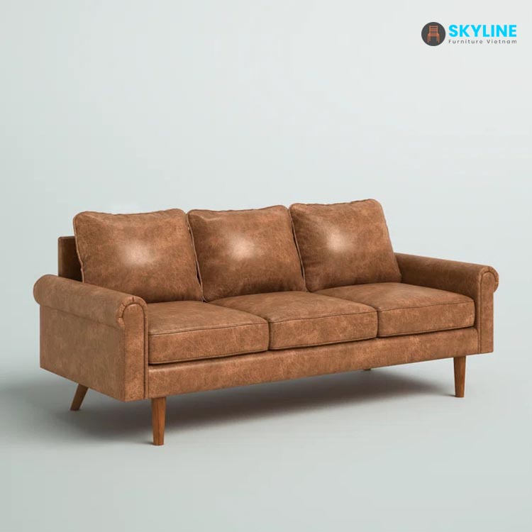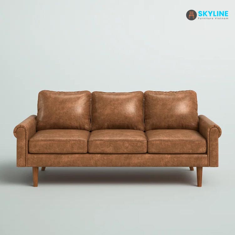 Chế sofa lấy cảm hứng từ cổ điển có khung gỗ tự nhiên vững chắc với bốn chân trụ và được bọc bằng chất liệu bọc da bò để có vẻ ngoài sống động và nó có màu nâu đậm pha trộn với nhiều cách phối màu khác nhau.