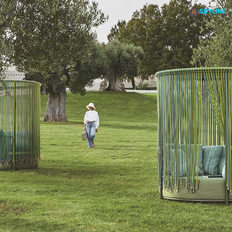 Bộ sofa SKLS025 được cấu tạo từ khung thép hoặc nhôm chắc chắn và được bọc 1 lớp sơn tĩnh điện, với lớp sơn này vừa tạo màu cho sản phẩm vừa chống gỉ sét an mòn trên sản phẩm giúp sản phẩm có độ bền cao. Sofa sân vườn thư giãn SKLS025 có mặt vải lưới che ở trên, dây trang trí bằng sợi dây dù (rope) nhiều màu sắc. Chỗ ngồi rộng và hình tròn khiến nó trở nên hoàn hảo cho những giây phút thư giãn trong vườn hoặc bên hồ bơi, trong khi phần trên của ghế mang lại bóng râm tinh tế khỏi những tia nắng gay gắt nhất.